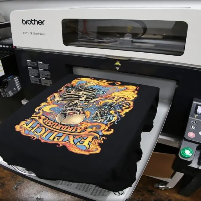 Impresora textil directa a prenda (DTG), perfecta para estampados personalizados en poleras, bolsas y ropa con gran nivel de detalle y acabado profesional.